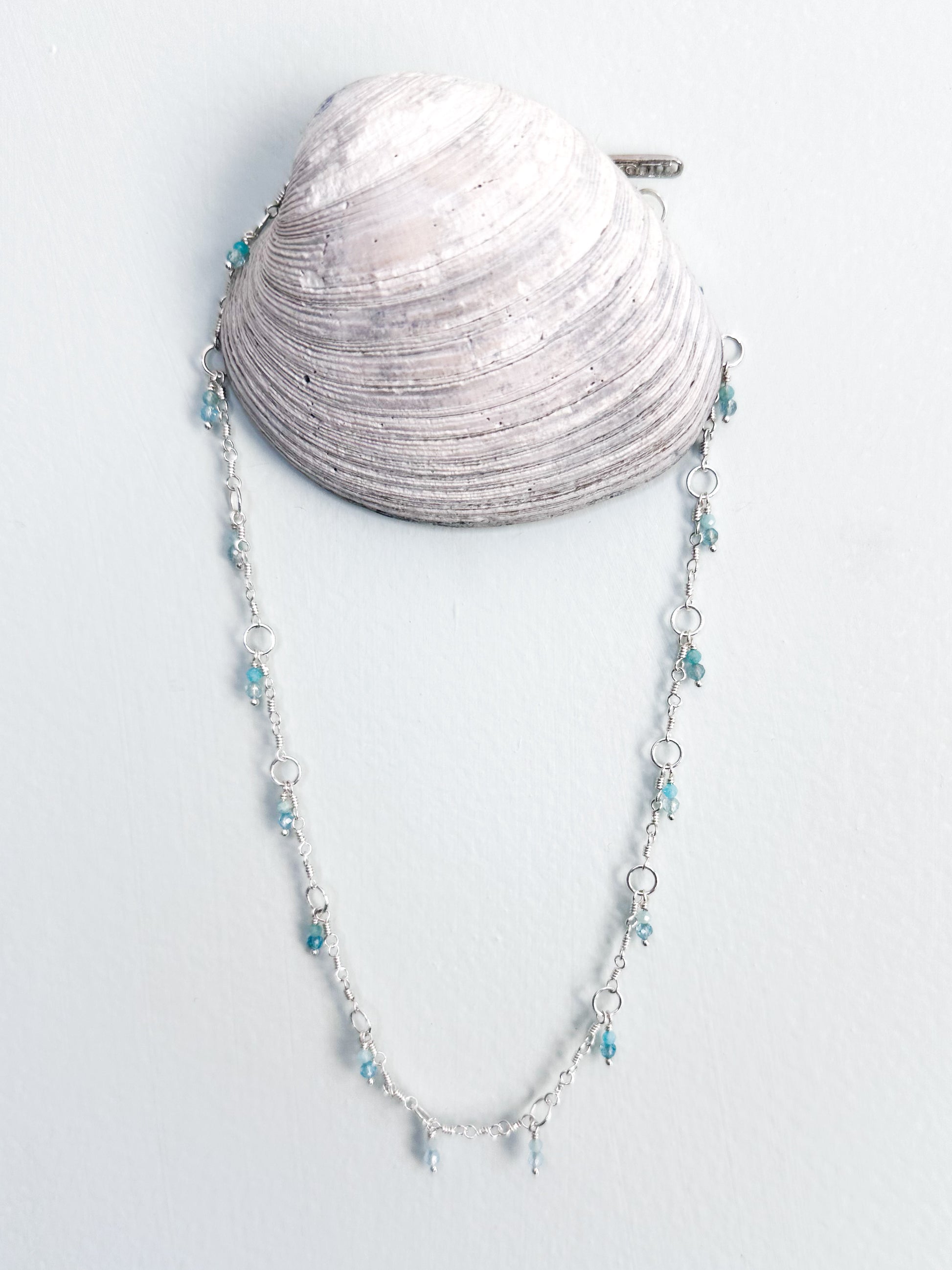 The necklace pictured below has a round, faceted ,pale blue aquamarine gemstone on the bottom with a slightly smaller, more teal blue ,round, faceted apatite gemstone on top